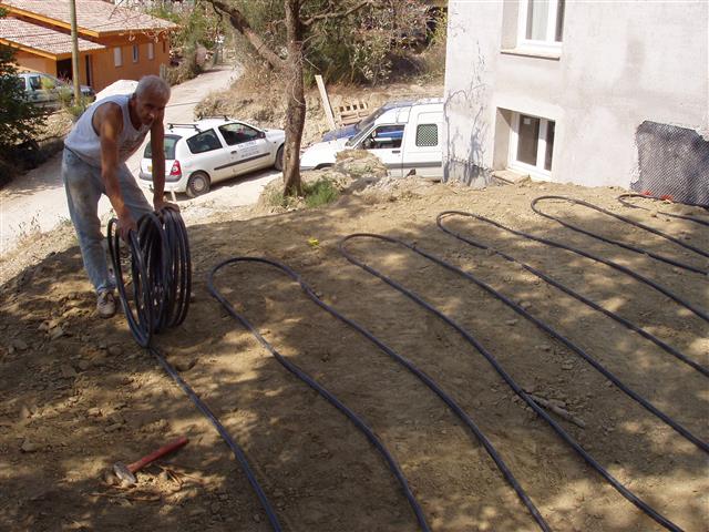 Les tubes sont disposés à une distance de 50 cm en largeur et en hauteur, sur une tranchée de 25 mètres de long il est possible de disposer 200 m de tube soit 2000W de captage gratuit